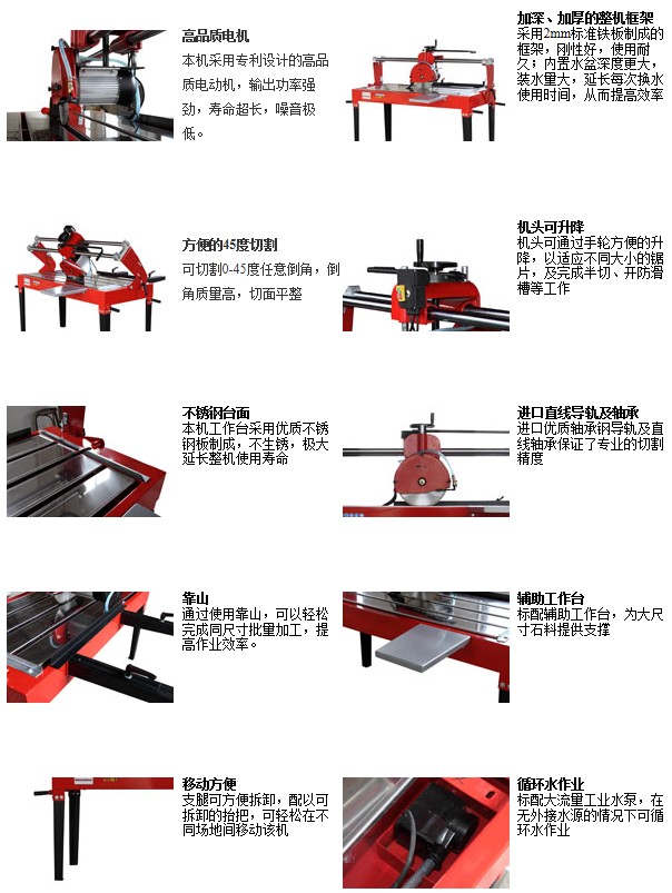 本款機器專為各類石材,陶瓷及磚類提供專業(yè)的切割效果而設計。該機器設計簡單合理,自動帶水環(huán)保作業(yè),安裝及操作簡便且不受任何場地的限制。多種切割長度和深度可供用戶選擇,左右兩側(cè)的輔助工作臺同時增強了機器的擴展性能。鋁合金材質(zhì)支撐和機頭及軸承鋼導軌保證了機器的輕便性能和切割精度,不銹鋼臺面和加厚的機身大大提高了機器的耐久度和使用壽命。廣泛的切割用途配以45°角切割效果,使得這款機器成為中小型切割需求中的理想解決方案。